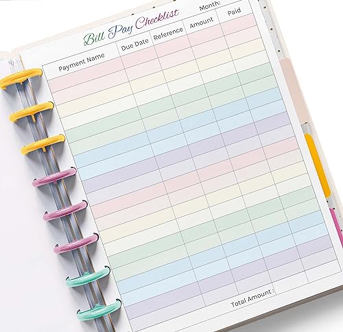 Colorful Monthly Budget Forms Bill Pay Checklist for Medium Size 9 Disc Planners, Fits 9-Disc Notebooks, 7"x9.25"