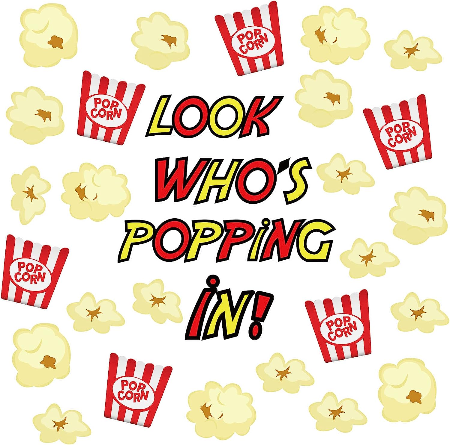 - Cute and Delicate: cutouts are designed in the shape of popcorn, popcorn decorations are fun and innovative, plus cute popcorn box, and the middle area allows you to write your name, birthday, goal, motto; They go well with inspirational quotes [look who's popping in], to make your classroom, school event cute and attractive