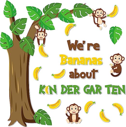 - You Will Get: Comes with 84 pieces of kindergarten classroom bulletin board decorations. which are tree trunk, bananas, leaves, monkey, and some letter cards that mean "We're Bananas about KINDERGARTEN". the quantity and size are enough for your wall decoration.