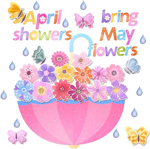 - SET PACKAGE - You will receive 59 pieces of spring bulletin board decorations, consisting of 6 kinds of cut outs, include 12 pcs raindrop, 12 pcs butterfly with 6 designs, 5 pcs of printed words, 28 pcs flower in 14 designs, 1 pcs umbrella and 1 pcs umbrella handle, sufficient to meet your various needs.