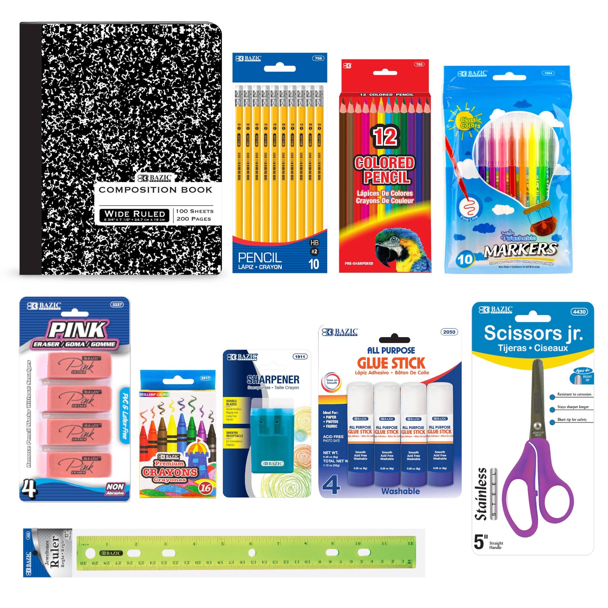 WHAT'S INCLUDED. (1) Wide rule composition book, (10) #2 Premium yellow pencils, (12) Colored pencils, (10) Washable markers, (16) Color Crayon, Pink eraser, (1) Ruler 12", (1) Sharpener, (1) Glue stick, and (1) Blunt Tip Scissor 5"