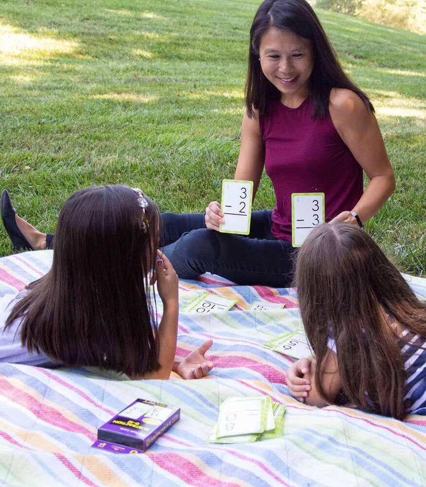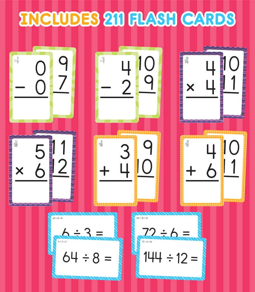 The Brighter Child(R) Math Flash Card Set offers children a fun and easy way to practice their addition, subtraction, multiplication, and division skills. The set features 216 total cards, including 53 addition, 52 subtraction, 53 division, and 53 multiplication flash cards to practice math facts 0–12 with the answers on the opposite side of each card. 5 bonus resource cards are included for additional math games and tips. Bright, bold numbers are placed on a white background for easy reading.