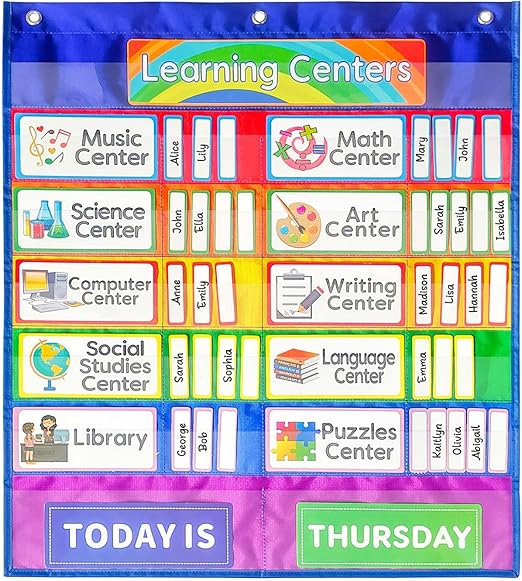- WHAT YOU WILL GET:1 piece of classroom pocket chart,16 pieces activity cards,80 pieces blank dry earse name cards and 1 pieces title card,Today is and 7 weeks cards