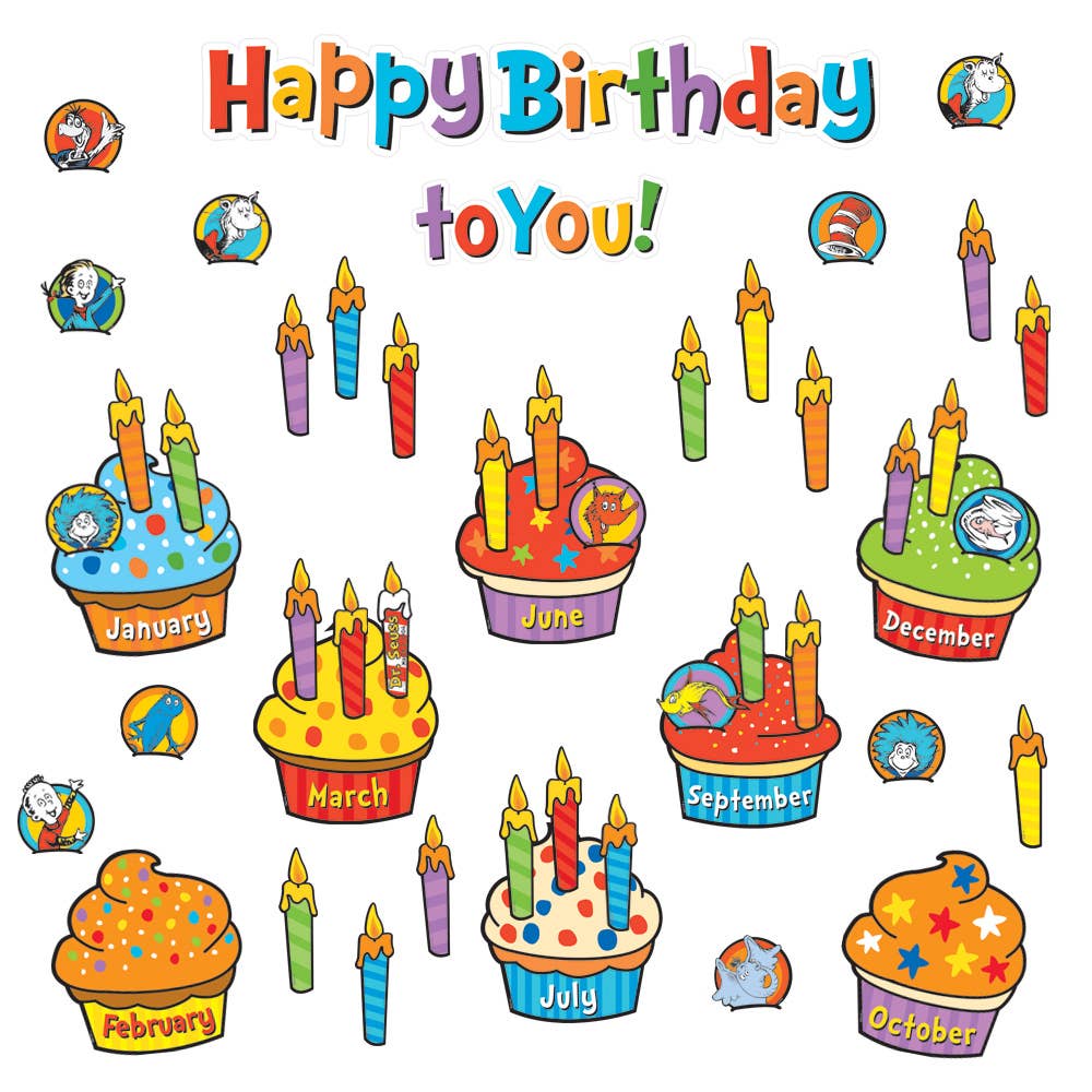 •Celebrate your students' birthdays with Dr. Seuss! 70 piece set includes 12 Cupcakes for each month of the year, 41 Candles, 13 Character Cut Outs, and a 4 Piece Birthday Header. Packaged as 8 6" x 21" panels in a polybag with a header. Coordinates with Eureka's many Dr. Seuss™ Collections!