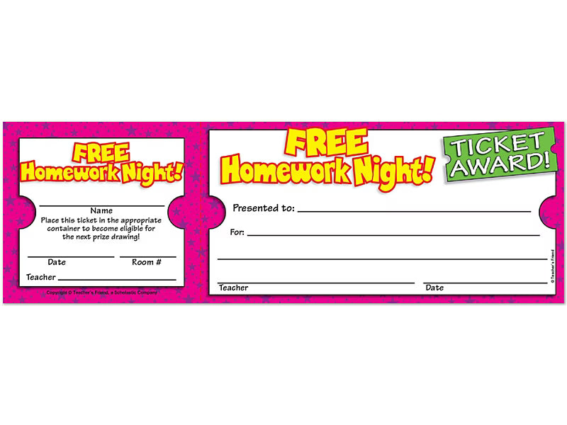 These clever ticket awards are padded for easy use! Each award is perforated into two parts—one part is filled out by the teacher for the student to take home to share with parents, and the other part is signed by the student and entered in a classroom or school-wide drawing for the chance to win a free homework night! This is a wonderful way to give positive reinforcement. Pack includes 100 awards; each measures 2 3/4" x 8 1/2".