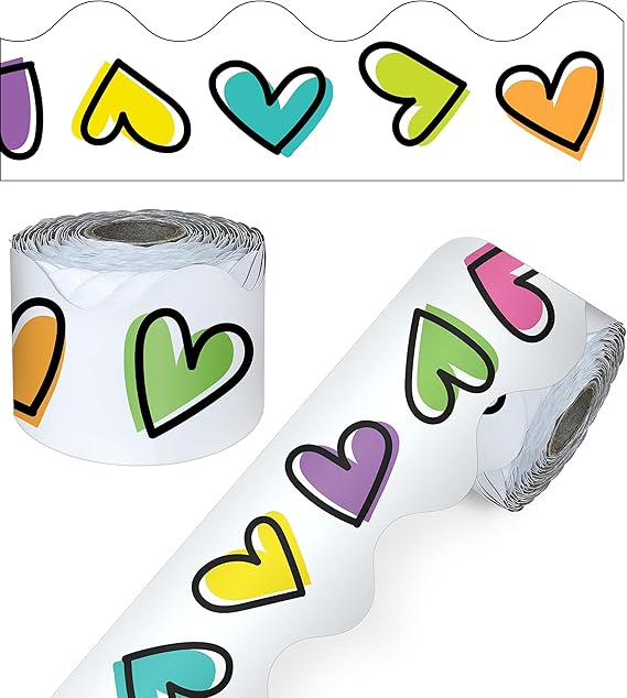 - What’s Included: One large paper roll of scalloped, doodle hearts bulletin board border is included to add the perfect finishing touches to chalkboard and classroom decorations, cubbies, bulletin boards, or even use as party decorations.