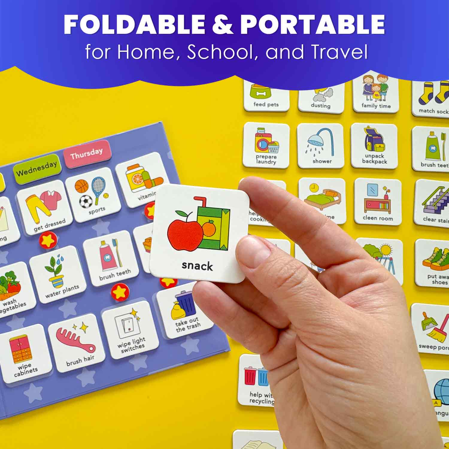 * With these Charts, you get the following: 📅1 foldable magnetic board for easy storage and travel; 🧲 72 routine magnets covering chores, hygiene, and good manners; ⭐️ Star reward magnets to celebrate completed tasks;