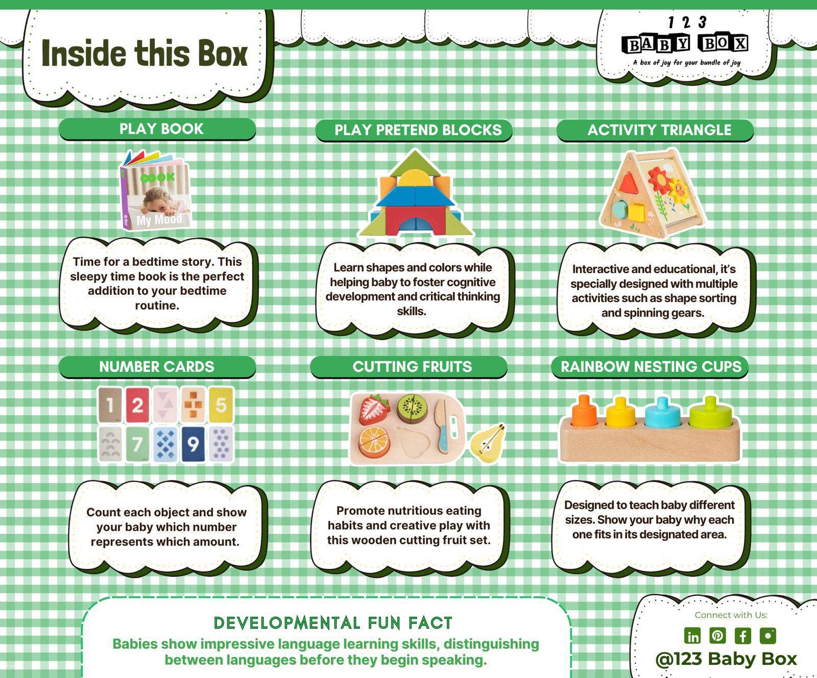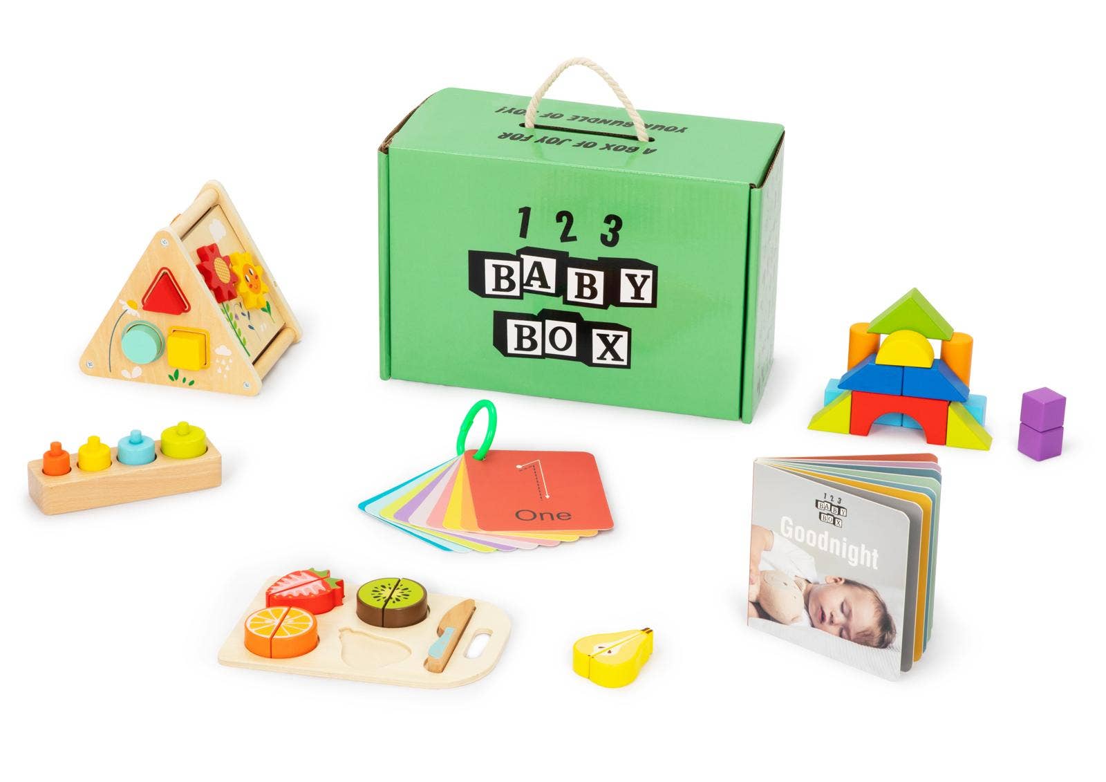 Educational box for babies aged 15-18 months, full of developmental items to aid baby in their cognitive growth. Each box comes with 6 products, all products are made from sustainable and safe material. These boxes encourage open ended play while helping to strength fine motor skills.