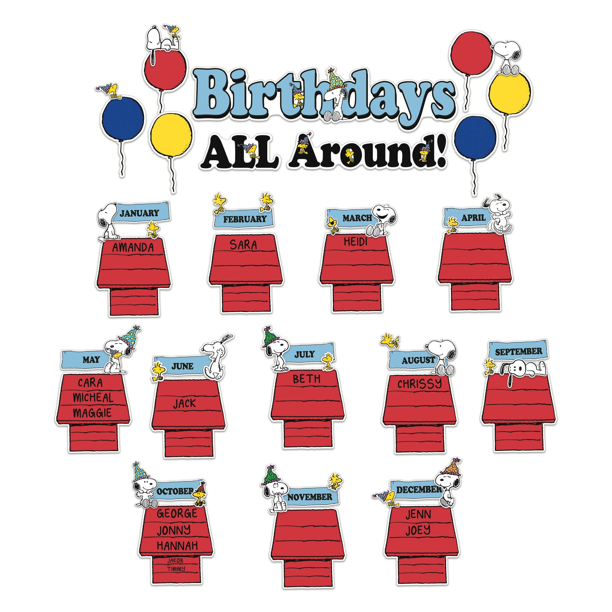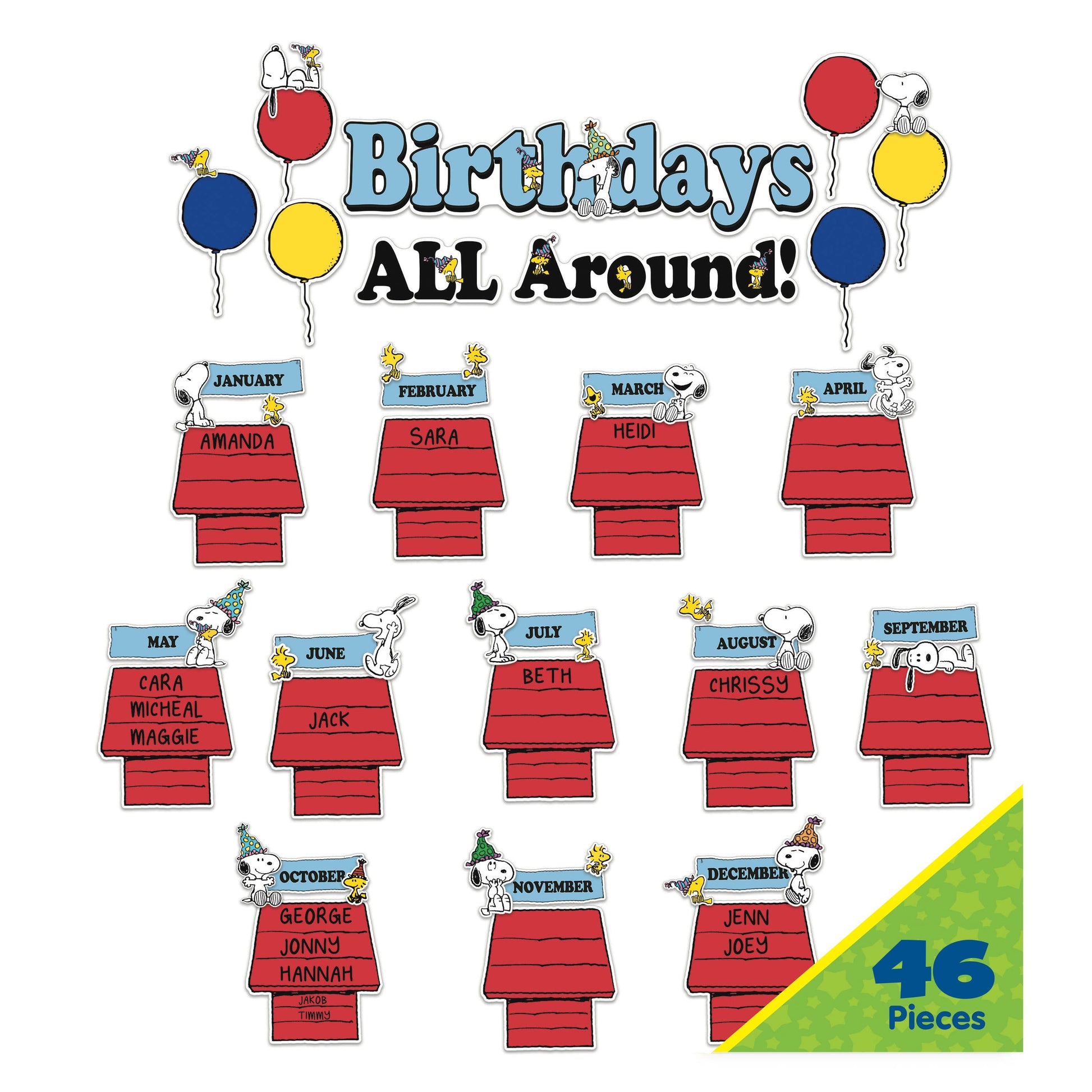•Celebrate your students' birthdays with a 58 Piece Set that Includes 8 Panels With: 3 piece "Birthdays All Around" header, 12 Snoopy cut-outs, 13 Woodstock cut-outs, 12 months of the year headers, 12 dog houses, and 6 balloon cut-outs.