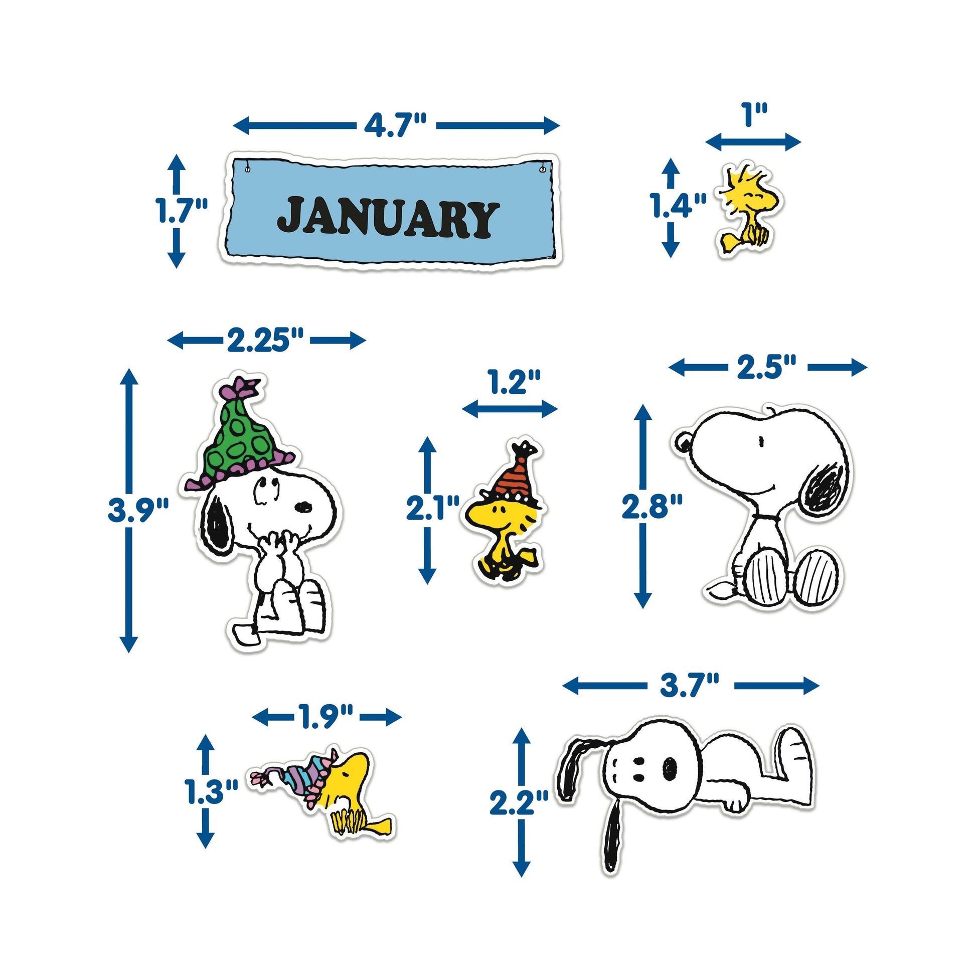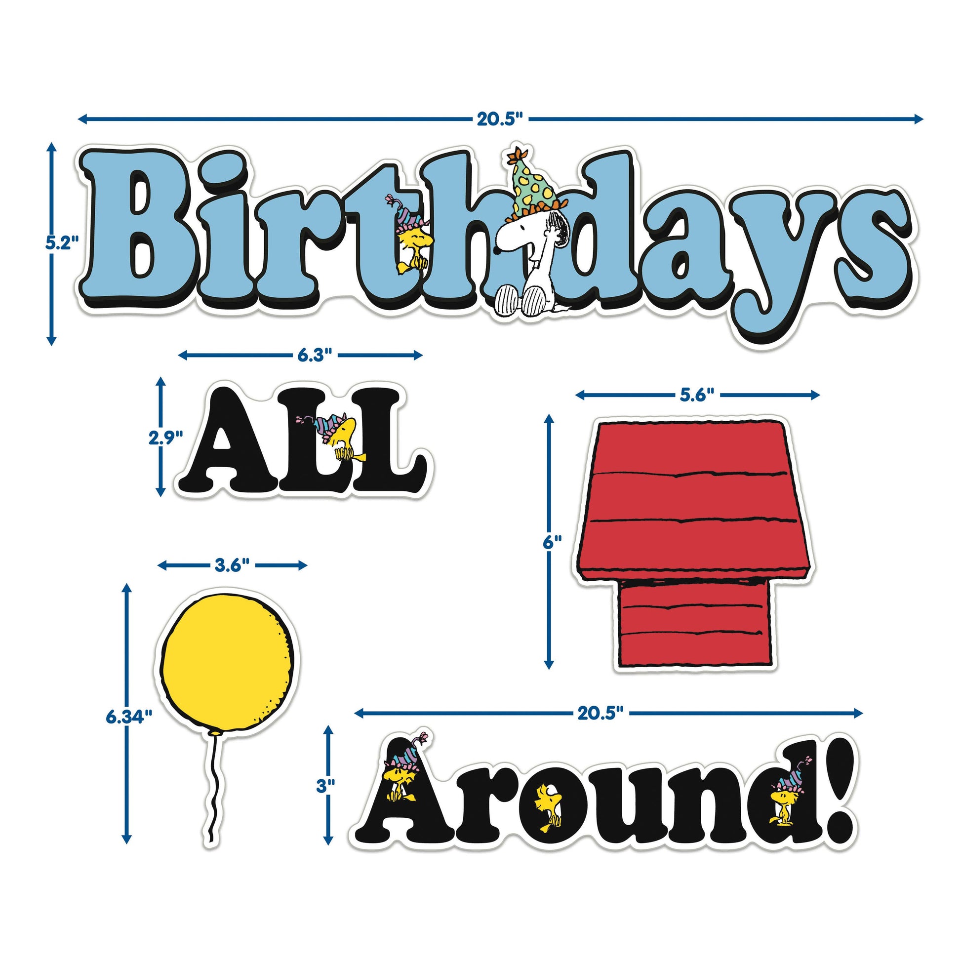 •What's Included - 58 Piece Set Includes 8 Panels With: 3 piece "Birthdays All Around" header, 12 Snoopy cut-outs, 13 Woodstock cut-outs, 12 months of the year headers, 12 dog houses, and 6 balloon cut-outs.