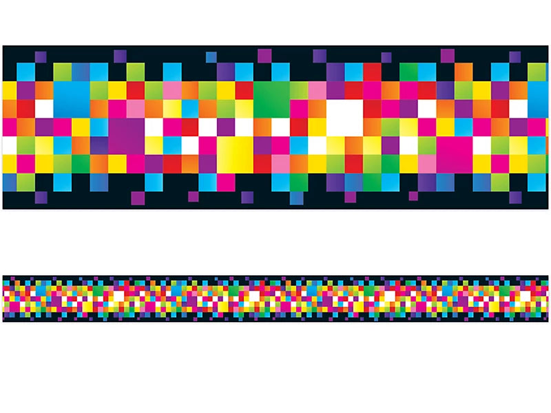 This attractive, contemporary, pixel-pattern border brings attention to your displays and messages! The straight-edge design fits spaces easily and can be layered with solid-color borders for extra visual appeal. Pack includes 11 precut, durable and reusable strips; each measures 2 3/4" x 39", for a total length of 35 3/4'.