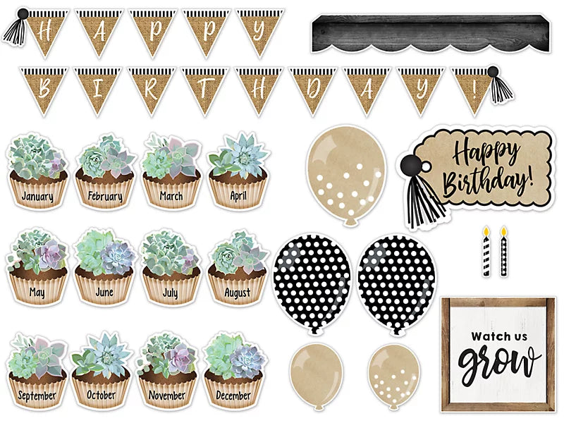 This festive classroom display makes it easy to highlight students’ birthdays! Featuring soothing colors, classic patterns and trendy designs, the bulletin board set is perfect for any area of the classroom. The set includes 79 pieces—a 14-piece “Happy Birthday!” pennant banner, a “Watch Us Grow” sign, a birthday tag, 7 balloons, 12 monthly cupcakes, 40 candles and 4 shelves; shelf pieces measure 3 1/2" x 21".