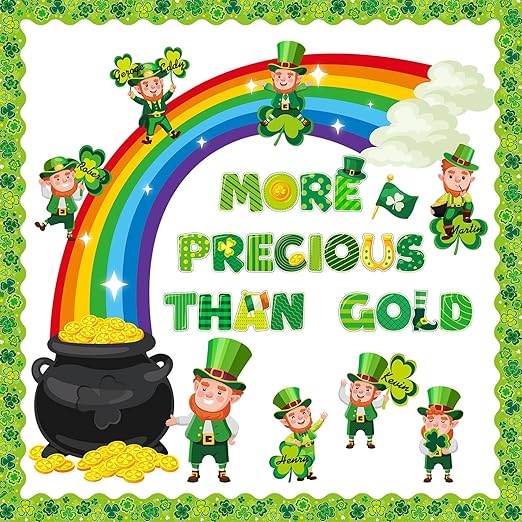 - St. Patrick's Day Bulletin Board: our St. Patrick's Day classroom bulletin board decorations are designed in Irish clover and St. Patrick's Day leprechaun elements, with words of [MORE PRECIOUS THAN GOLD]; They are suitable for children to cultivate artistic creativity and increase the fun of learning, bringing you a chic St. Patrick's Day classroom