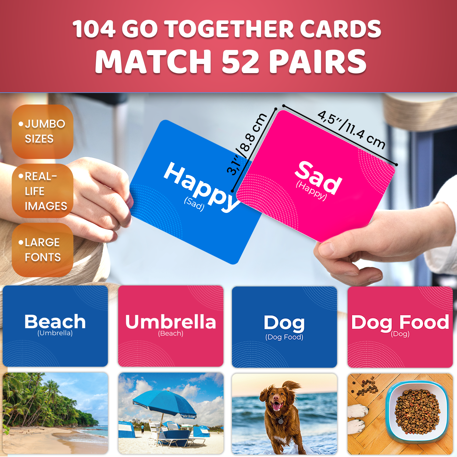 Featuring 52 matching pairs of nouns and verbs, this set helps children connect words meaningfully while developing their vocabulary.