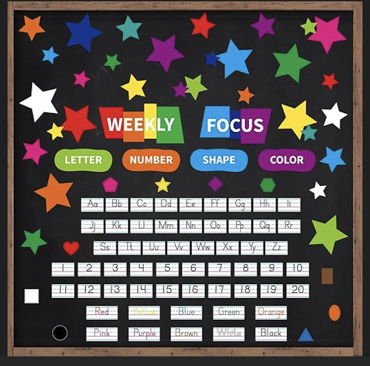 - Package Includes: you will receive a Weekly Focus bulletin board set, including 7 pieces of 1 title printed with words [Weekly Focus], 26 alphabet cards, 20 numbers cards, 10 cards of colors, 10 shapes cards, 4 little titles, 30 stars and 6 sheets of glue points, ideal combination, and complete set to satisfy your teaching or decoration needs