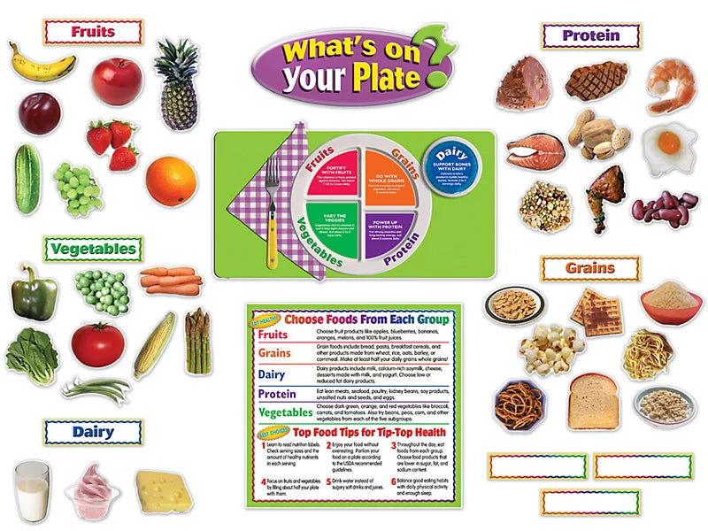 Encourage healthy eating habits with this bulletin board set based on the USDA’s MyPlate guidelines! Set includes 47 pieces—a “What’s on Your Plate?” header, a chart showing healthy food choices, a MyPlate place setting, 5 food group labels, 36 photographic food pieces and 3 customizable blank labels—plus a teacher’s guide. The largest piece measures 13" x 24 1/2".