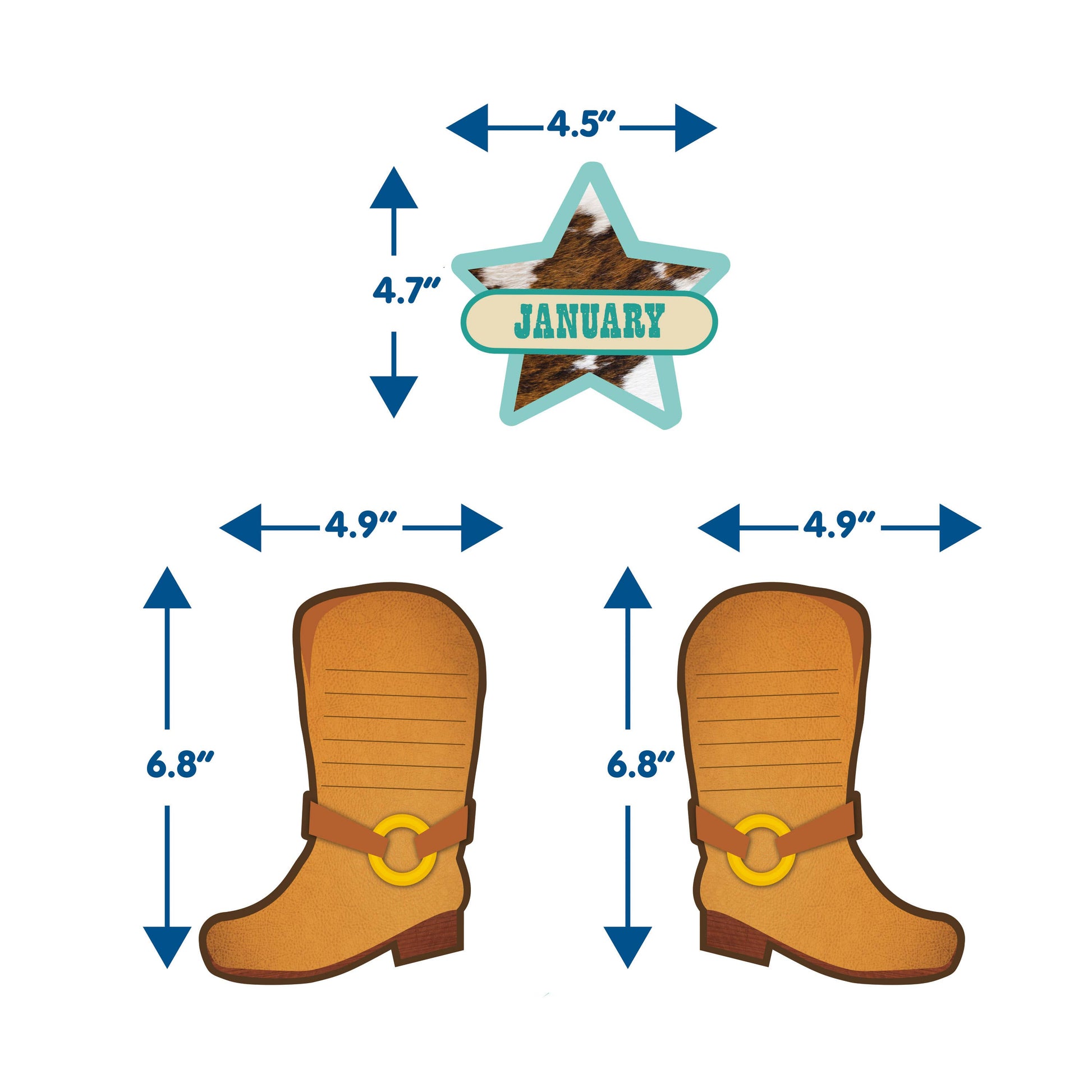•What's Included - 27 Piece Set Includes 8 Panels With: 12 Month Headers, 12 Write-In Boots, and a 3-piece "Boot Scootin' Celebration" Header.