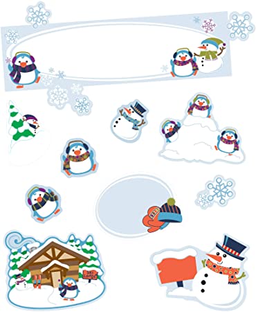 - DIMENSIONS: This set includes a 6-inch x 21-inch header, 5 1/2 inch x 21-inch signs, 5 1/2 inch x 10 1/4 inch winter scenes, 2 3/4 inch x 2 1/2 inch snowflakes, and 2 1/2 inch x 2 1/2 inch penguin cutouts for bulletin boards, lockers, desks, and door displays